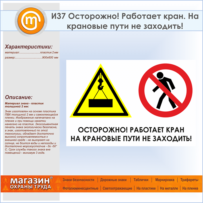 Знак «Осторожно! Работает кран. На крановые пути не заходить!», И37 на пластике, размером 900х600 мм предупреждает о работе крана и об опасности выхода или перехода крановых путей. Указательные таблички и предупреждающие знаки на строительной площадке помогут ориентироваться на месте строительства