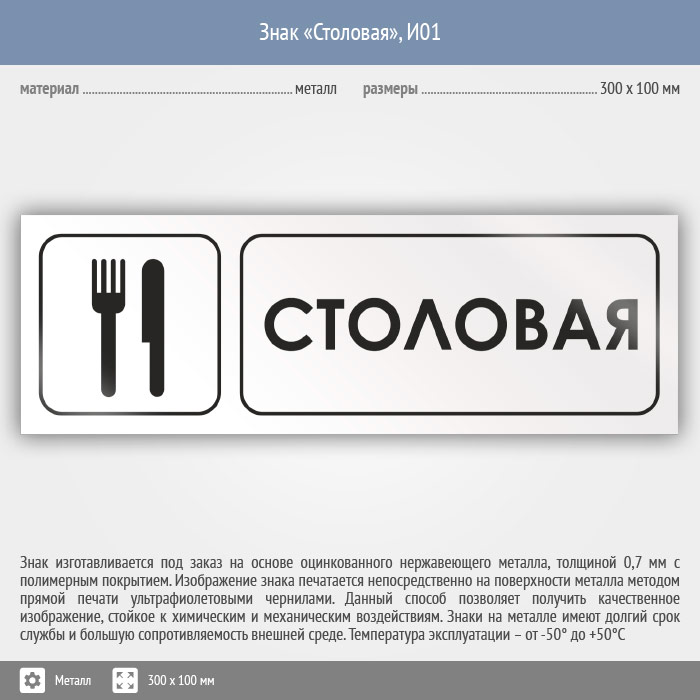 Знак «Столовая», И01 (металл, 300х100 мм)