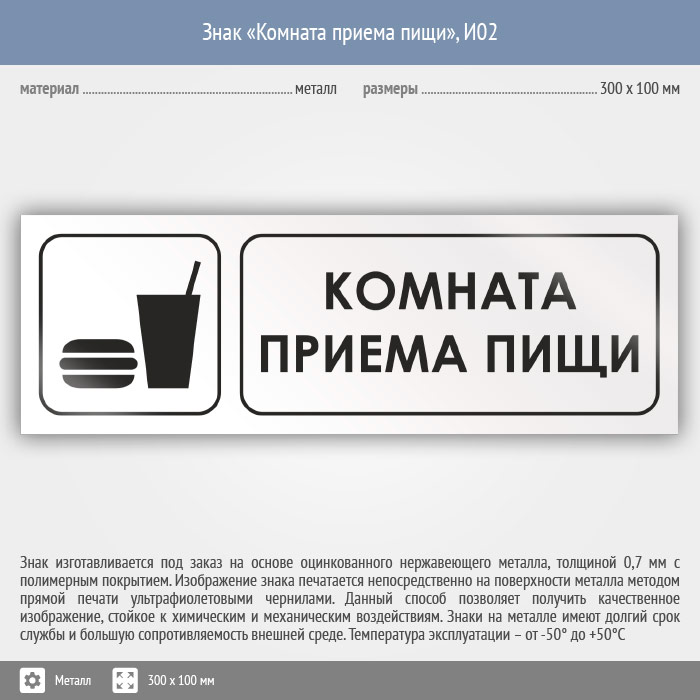 Знак «Комната приема пищи», И02 (металл, 300х100 мм)