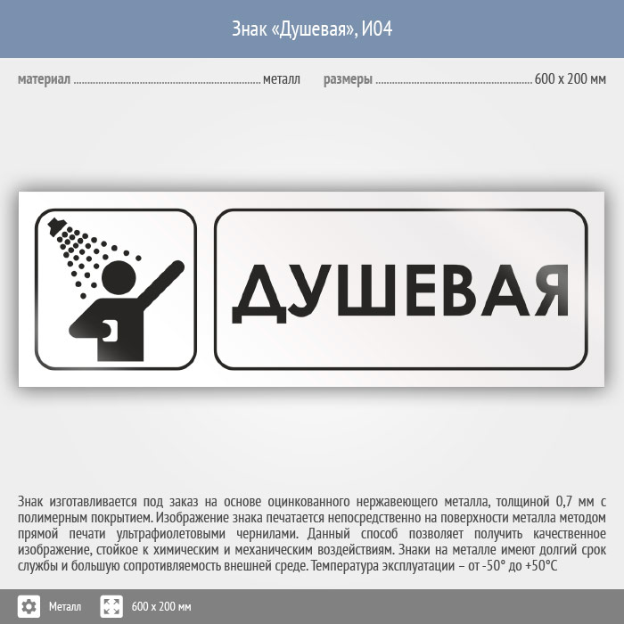 Знак «Душевая», И04 (металл, 600х200 мм)
