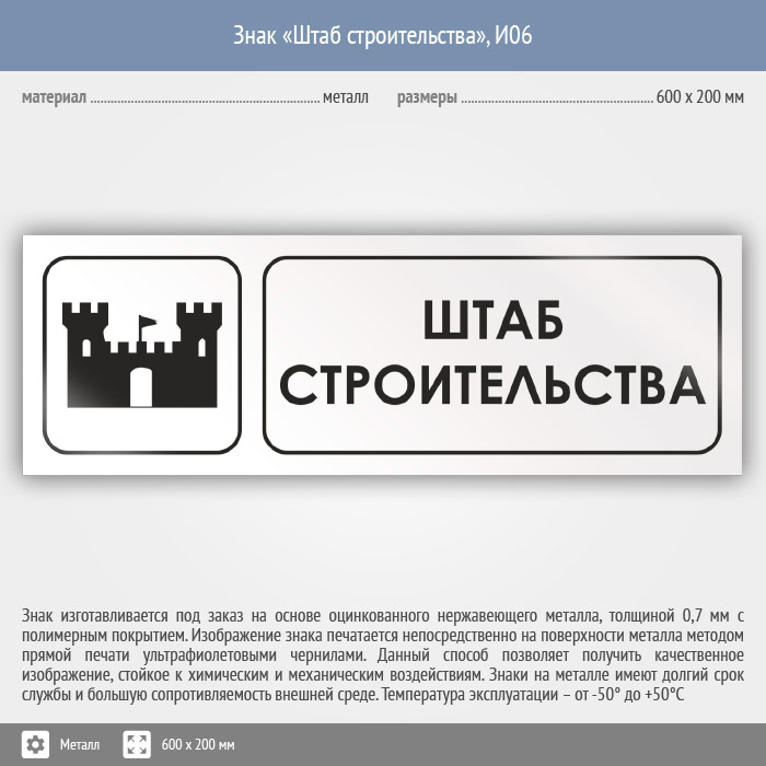 Знак «Штаб строительства», И06 (металл, 600х200 мм)