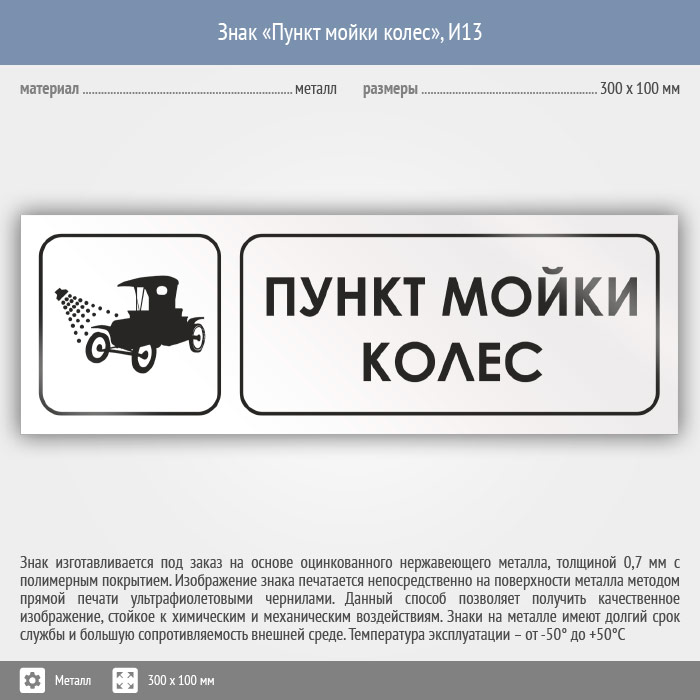 Знак «Пункт мойки колес», И13 (металл, 300х100 мм)