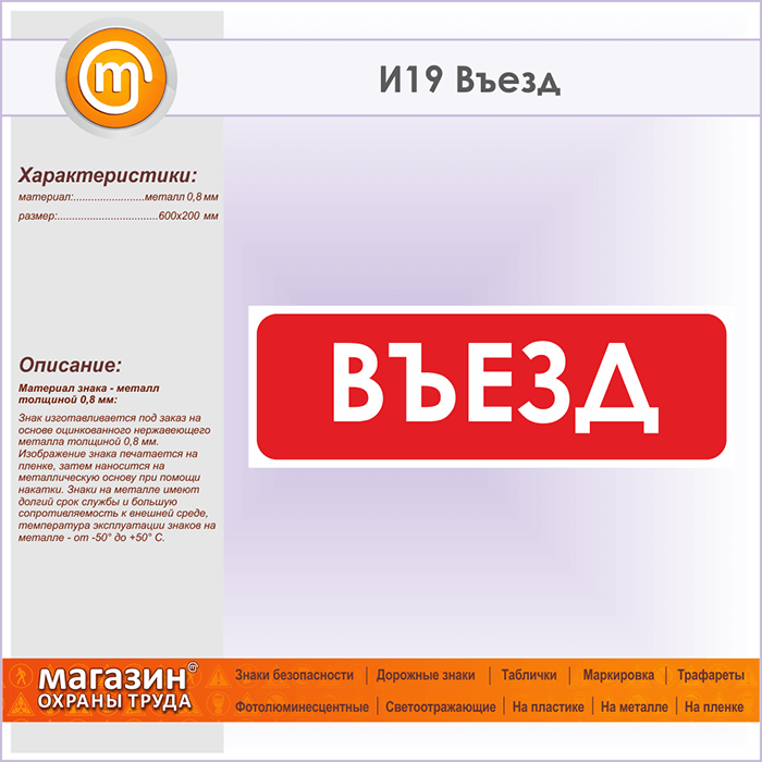 Знак «Въезд», И19 (металл, 600х200 мм)