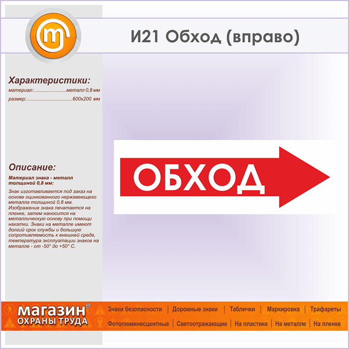 Знак «Обход (вправо)», И21 на металле, размером 600х200 мм обозначает, что в данном месте обход осуществляется с правой стороны. Указательные таблички и предупреждающие знаки на строительной площадке помогут ориентироваться на месте строительства