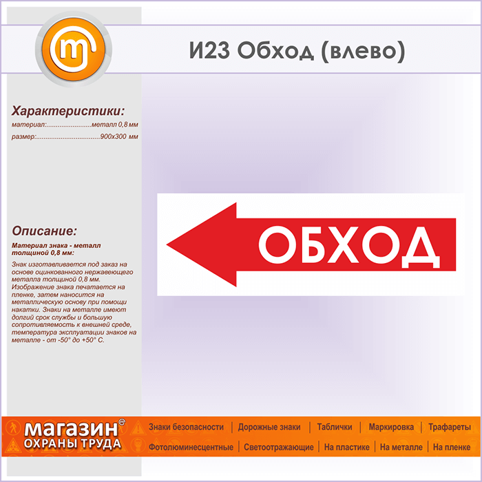 Знак «Обход (влево)», И23 на металле, размером 900х300 мм обозначает, что обход здесь осуществляется с левой стороны. Указательные таблички и предупреждающие знаки на строительной площадке помогут ориентироваться на месте строительства