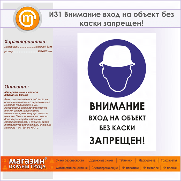 Знак «Внимание вход на объект без каски запрещен!», И31 на металле, размером 400х600 мм напоминает о необходимости использования средств защиты головы. Указательные таблички и предупреждающие знаки на строительной площадке помогут ориентироваться на месте строительства