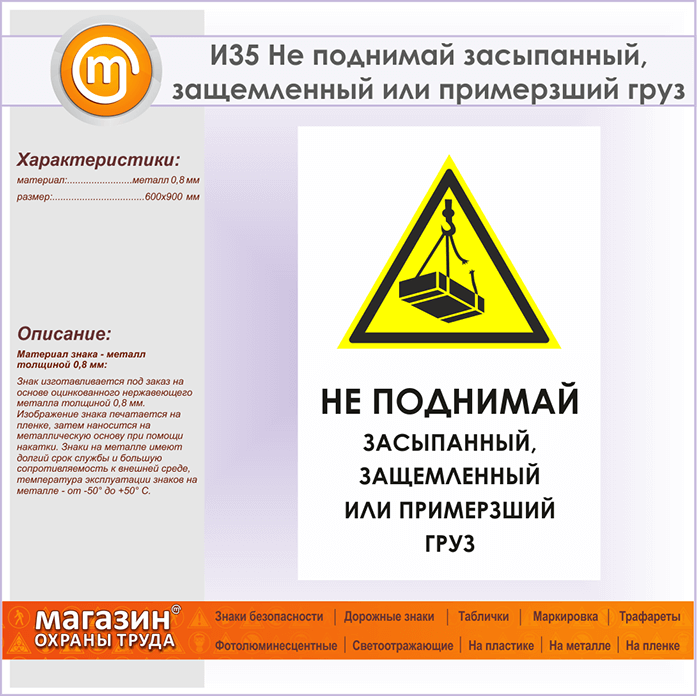 Знак «Не поднимай засыпанный, защемленный или примерзший груз», И35 на металле, размером 600х900 мм напоминает об опасности поднятия зажатого или примерзшего груза. Указательные таблички и предупреждающие знаки на строительной площадке помогут ориентироваться на месте строительства