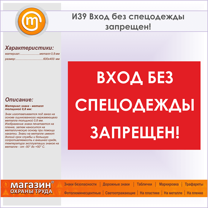 Знак «Вход без спецодежды запрещен!», И39 на металле, размером 600х400 мм запрещает проход на территорию без спецодежды. Указательные таблички и предупреждающие знаки на строительной площадке помогут ориентироваться на месте строительства