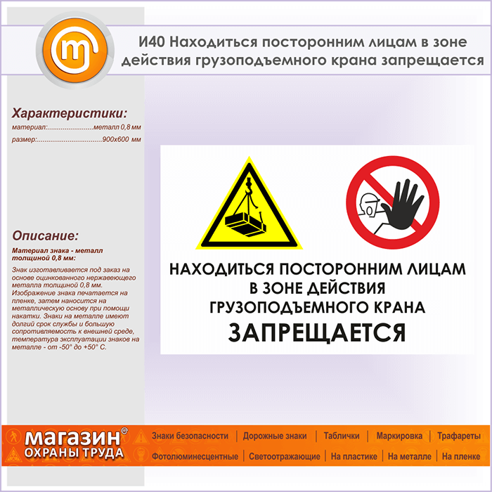 Знак «Находиться посторонним лицам в зоне действия грузоподъемного крана запрещается», И40 на металле, размером 900х600 мм напоминает о том, что находиться посторонним людям небезопасно, поэтому категорически запрещено. Указательные таблички и предупреждающие знаки на строительной площадке помогут ориентироваться на месте строительства