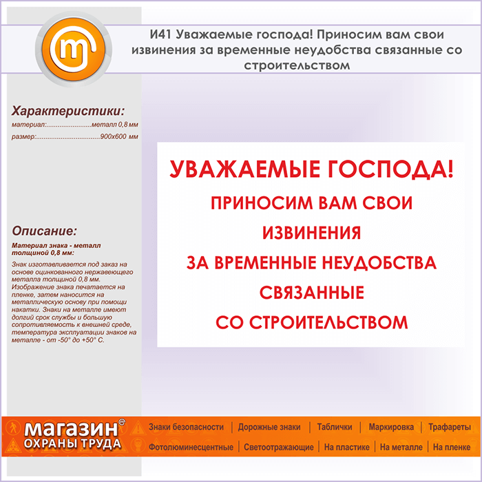 Знак «Уважаемые господа! Приносим вам свои извинения за временные неудобства, связанные со строительством», И41 на металле, размером 900х600 мм обязательно должна присутствовать на каждом строящемся объекте, ведь вежливость - это всегда хорошо. Указательные таблички и предупреждающие знаки на строительной площадке помогут ориентироваться на месте строительства