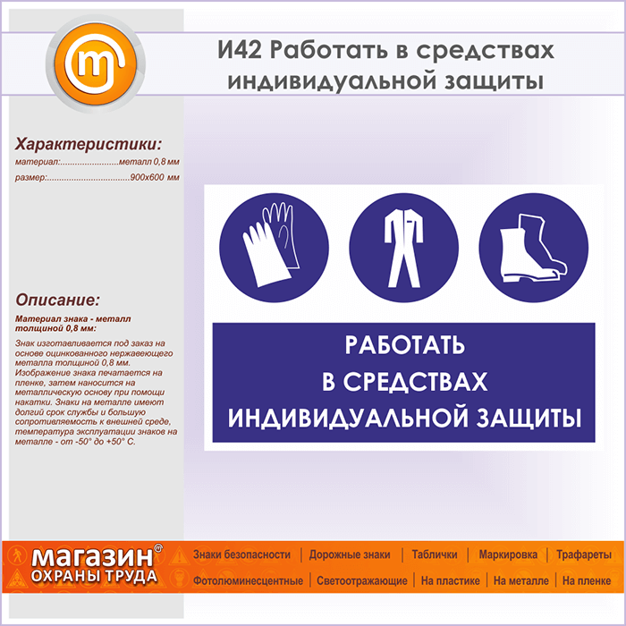 Знак «Работать в средствах индивидуальной защиты», И42 на металле, размером 900х600 мм напоминает об обязательном использовании СИЗ. Указательные таблички и предупреждающие знаки на строительной площадке помогут ориентироваться на месте строительства