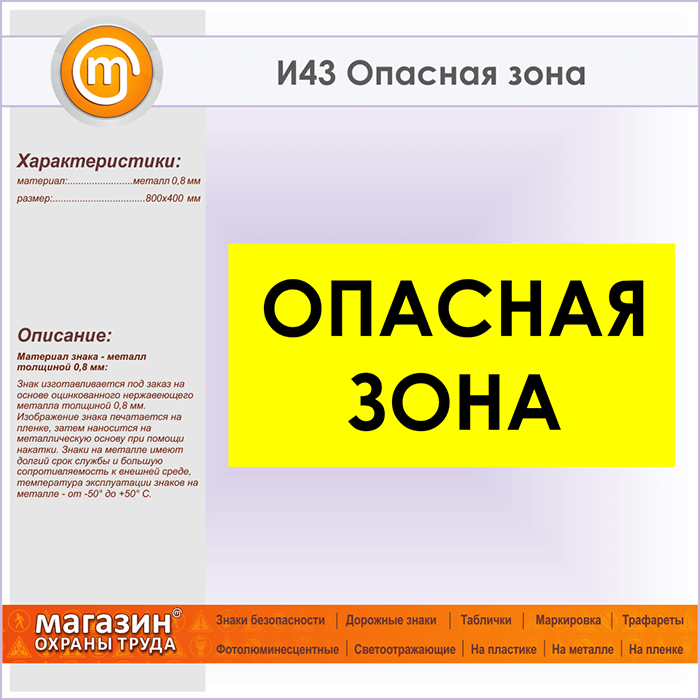 Знак «Опасная зона», И43 на металле, размером 800х400 мм предупреждает о приближении к опасному месту. Указательные таблички и предупреждающие знаки на строительной площадке помогут ориентироваться на месте строительства