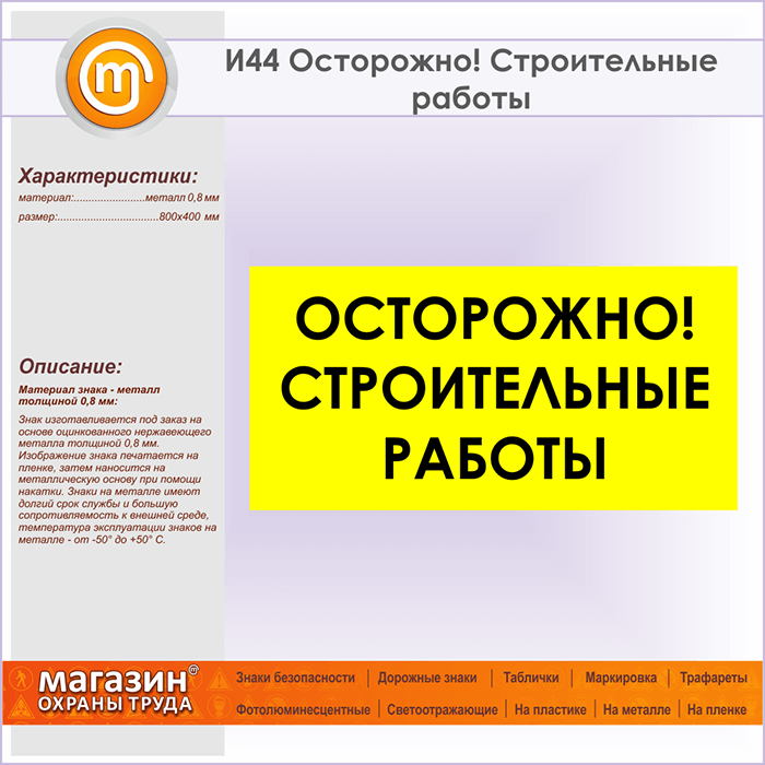 Знак «Осторожно! Строительные работы», И44 (металл, 800х400 мм)