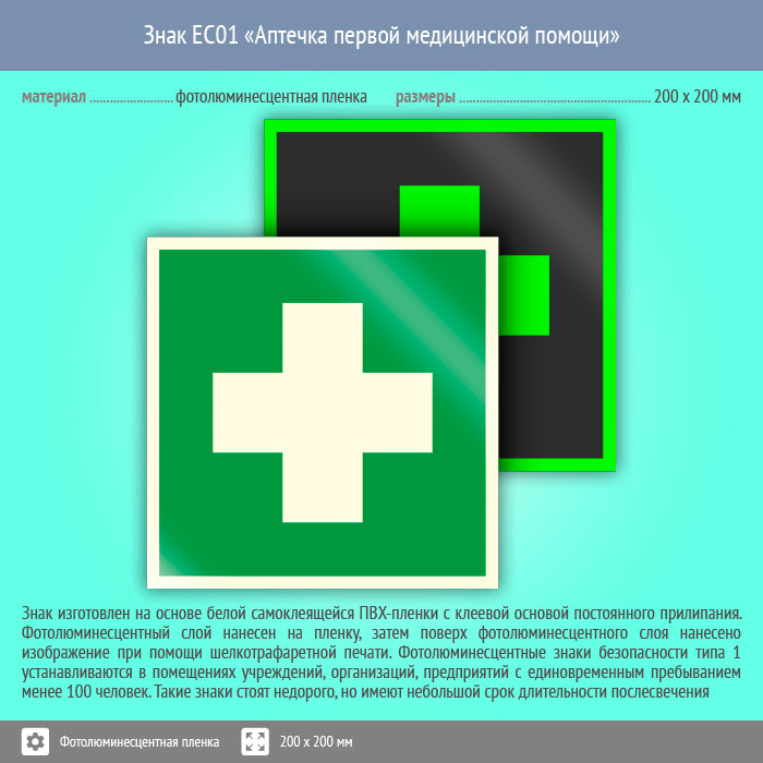 Знак EC01 «Аптечка первой медицинской помощи» на фотолюминесцентной пленке, размером 200х200 мм указывает на место хранения медицинской аптечки или препаратов. Знаки медицинского и санитарного назначения изготовлены согласно ГОСТ Р 12.4.026-2015 и предназначены для обозначения размещения пунктов первой медицинской помощи и гигиенических процедур, а также средств оказания доврачебной помощи