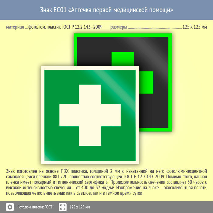 Знак EC01 «Аптечка первой медицинской помощи» на фотолюминесцентном пластике по ГОСТ 34428-2018, размером 125х125 мм указывает на место хранения медицинской аптечки или препаратов. Знаки медицинского и санитарного назначения изготовлены согласно ГОСТ Р 12.4.026-2015 и предназначены для обозначения размещения пунктов первой медицинской помощи и гигиенических процедур, а также средств оказания доврачебной помощи