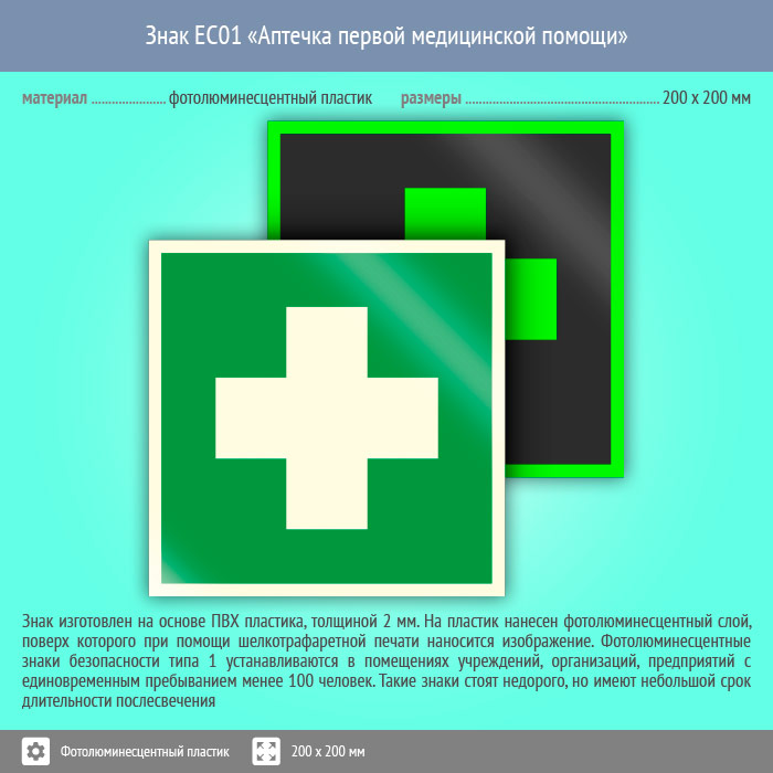 Знак EC01 «Аптечка первой медицинской помощи» на фотолюминесцентном пластике, размером 200х200 мм указывает на место хранения медицинской аптечки или препаратов. Знаки медицинского и санитарного назначения изготовлены согласно ГОСТ Р 12.4.026-2015 и предназначены для обозначения размещения пунктов первой медицинской помощи и гигиенических процедур, а также средств оказания доврачебной помощи