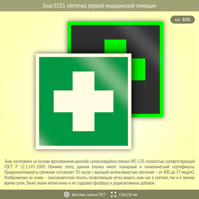 Знак EC01 «Аптечка первой медицинской помощи» на фотолюминесцентной пленке по ГОСТ 34428-2018, размером 150х150 мм указывает на место хранения медицинской аптечки или препаратов. Знаки медицинского и санитарного назначения изготовлены согласно ГОСТ Р 12.4.026-2015 и предназначены для обозначения размещения пунктов первой медицинской помощи и гигиенических процедур, а также средств оказания доврачебной помощи