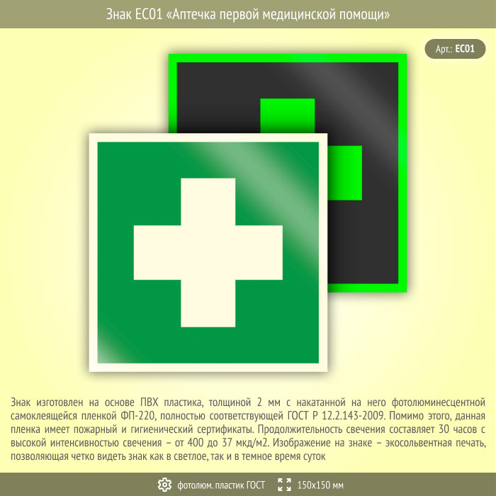 Знак EC01 «Аптечка первой медицинской помощи» на фотолюминесцентном пластике по ГОСТ 34428-2018, размером 150х150 мм указывает на место хранения медицинской аптечки или препаратов. Знаки медицинского и санитарного назначения изготовлены согласно ГОСТ Р 12.4.026-2015 и предназначены для обозначения размещения пунктов первой медицинской помощи и гигиенических процедур, а также средств оказания доврачебной помощи