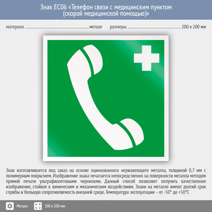 Знак EC06 «Телефон связи с медицинским пунктом (скорой медицинской помощью)» на металле, размером 200х200 мм указывает, что данный телефон предназначен исключительно для вызова медицинского персонала. Знаки медицинского и санитарного назначения изготовлены согласно ГОСТ Р 12.4.026-2015 и предназначены для обозначения размещения пунктов первой медицинской помощи и гигиенических процедур, а также средств оказания доврачебной помощи