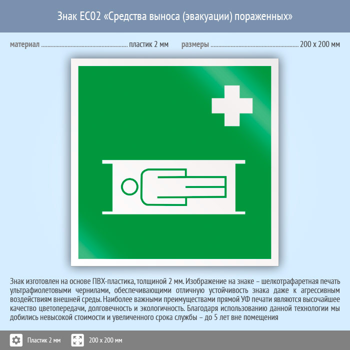 Знак EC02 «Средства выноса (эвакуации) пораженных» (пластик, 200х200 мм)