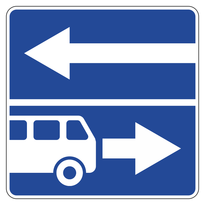 Знак обозначает выезд на дорогу с полосой для маршрутных транспортных средств (знак 5.11), движение которых осуществляется по специально выделенной полосе навстречу общему потоку движения транспортных средств. На перекрестке, перед которым установлен знак 5.13.2, запрещается поворот направо. Разворот не запрещается