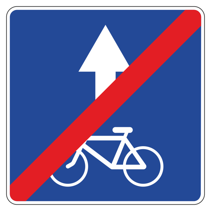 Знак 5.14.3 «Конец полосы для велосипедистов» отменяет правила, введённые знаком 5.14.2. Он свидетельствует о том, что особый режим движения для водителей двухколёсных транспортных средств утрачивает силу, и они выезжают на дорогу с общими правилами. Если знак 5.14.3 расположен над дорогой, то его действие распространяется только на ту полосу, над которой они размещены. Действие знака, который расположен у правого края дороги, распространяется только на правую полосу