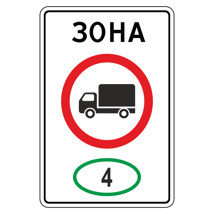Знак обозначает место, с которого начинается территория (участок дороги), где запрещено движение грузовых автомобилей, тракторов и самоходных машин: экологический класс которых, указанный в регистрационных документах на эти транспортные средства, ниже экологического класса, указанного на знаке; экологический класс которых не указан в регистрационных документах на эти транспортные средства