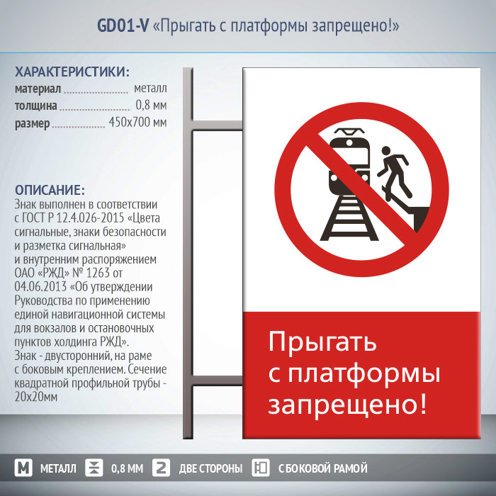 Знак «Прыгать с платформы запрещено!», GD01-V (двусторонний вертикальный, 450х700 мм, металл, на раме с боковым креплением)