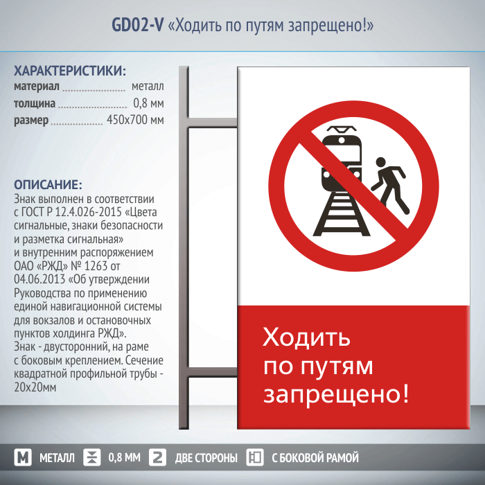 Знак «Ходить по путям запрещено!», GD02-V (двусторонний вертикальный, 450х700 мм, металл, на раме с боковым креплением)