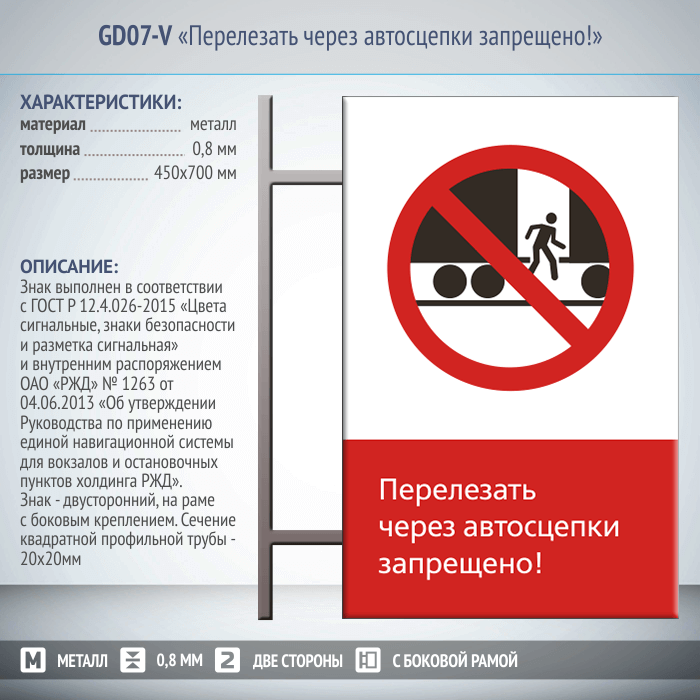 Знак «Перелезать через автосцепки запрещено!», GD07-V (двусторонний вертикальный, 450х700 мм, металл, на раме с боковым креплением)