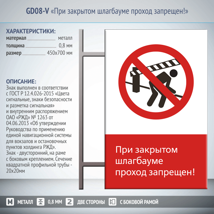 Двусторонний знак безопасности на раме с боковым креплением «При закрытом шлагбауме проход запрещен!» изготовлен на металле, толщиной 0,8 мм и размером 450х700мм в соответствии с: