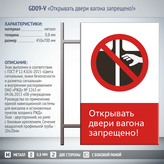 Знак «Открывать двери вагона запрещено!», GD09-V (двусторонний вертикальный, 450х700 мм, металл, на раме с боковым креплением)