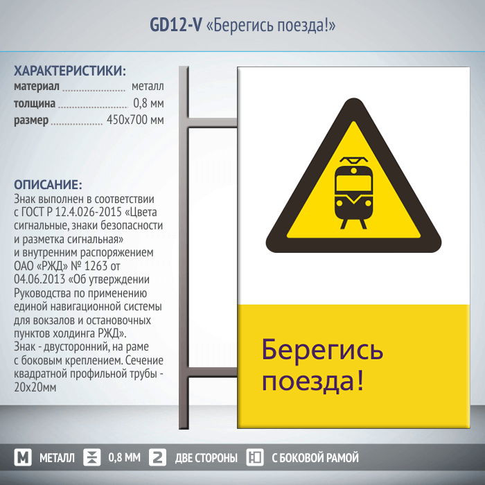 Знак «Берегись поезда!», GD12-V (двусторонний вертикальный, 450х700 мм, металл, на раме с боковым креплением)