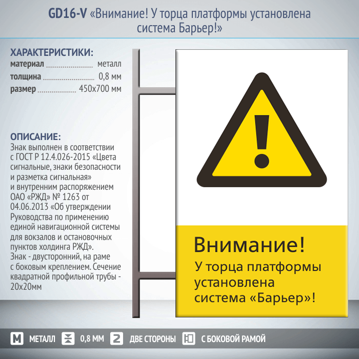Двусторонний знак безопасности на раме с боковым креплением «Внимание! У торца платформы установлена система Барьер!» изготовлен на металле, толщиной 0,8 мм и размером 450х700мм в соответствии с: