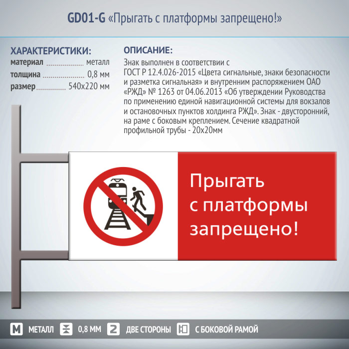 Знак «Прыгать с платформы запрещено!», GD01-G (двусторонний горизонтальный, 540х220 мм, металл, на раме с боковым креплением)