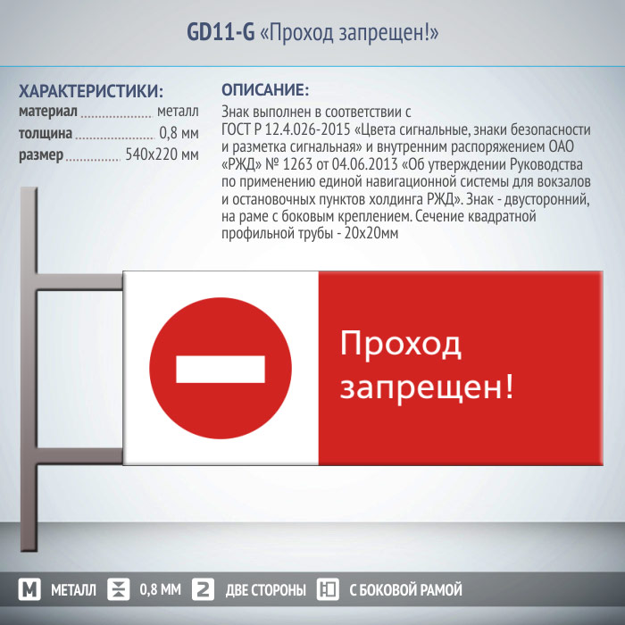 Знак «Проход запрещен!», GD11-G (двусторонний горизонтальный, 540х220 мм, металл, на раме с боковым креплением)