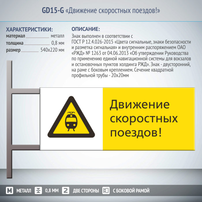 Знак «Движение скоростных поездов!», GD15-G (двусторонний горизонтальный, 540х220 мм, металл, на раме с боковым креплением)