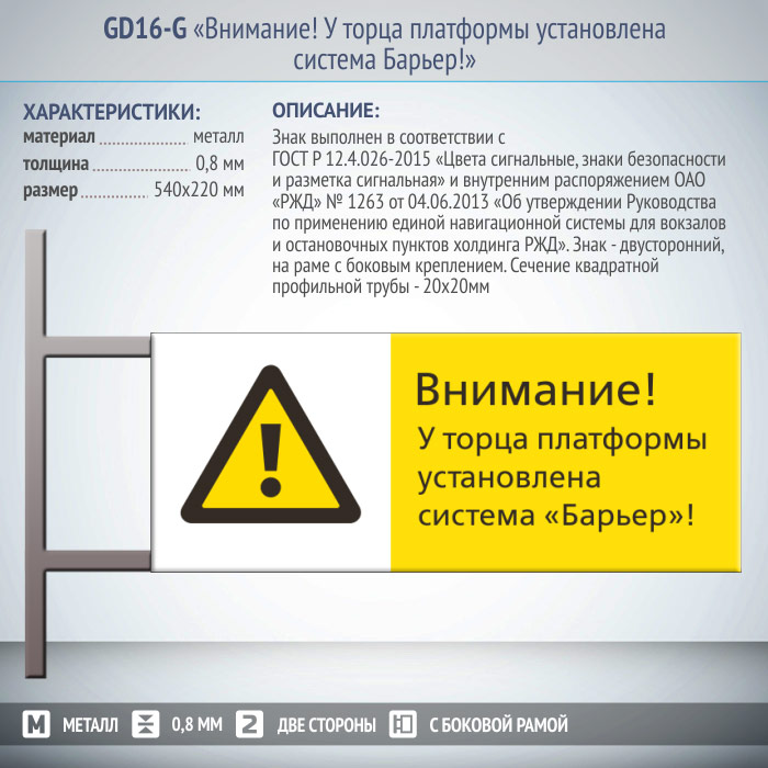 Двусторонний знак безопасности на раме с боковым креплением «Внимание! У торца платформы установлена система Барьер!» изготовлен на металле, толщиной 0,8 мм и размером 450х700мм в соответствии с: