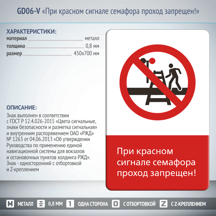 Знак «При красном сигнале семафора проход запрещен!», GD06-V (односторонний вертикальный, 450х700 мм, металл, с отбортовкой и Z-креплением)