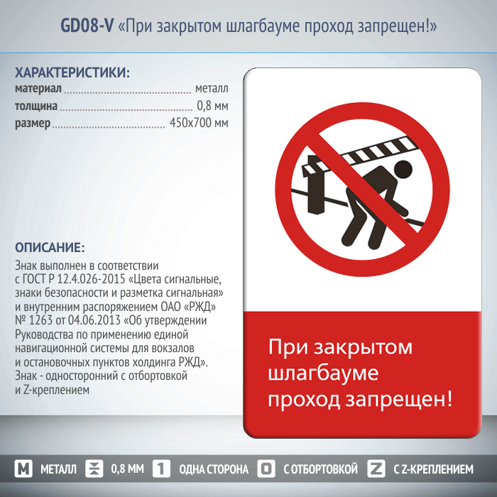 Односторонний знак безопасности «При закрытом шлагбауме проход запрещен!» изготовлен на металле, толщиной 0,8 мм и размером 450х700мм в соответствии с: