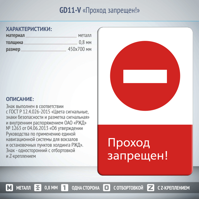Знак «Проход запрещен!», GD11-V (односторонний вертикальный, 450х700 мм, металл, с отбортовкой и Z-креплением)