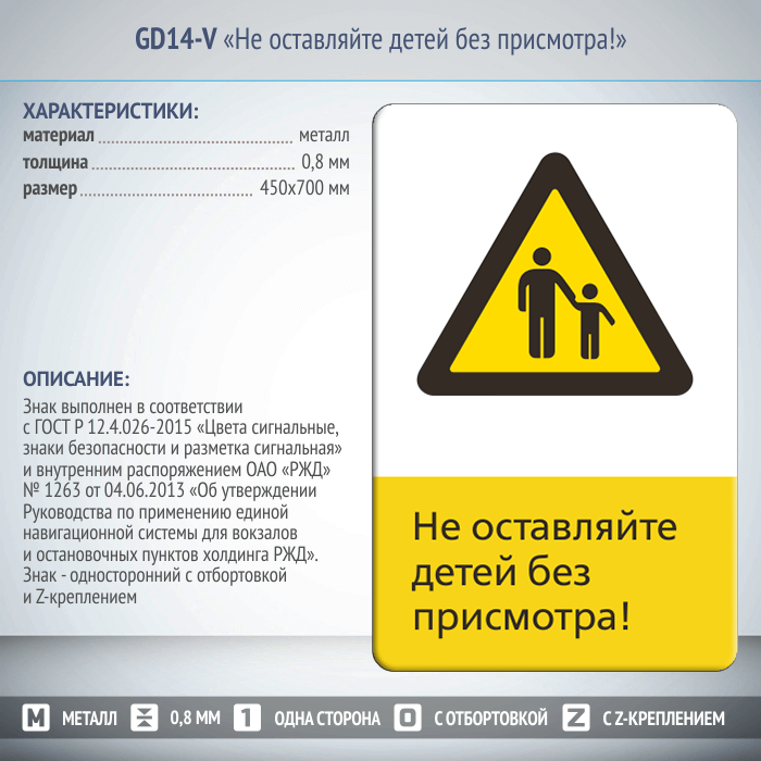 Односторонний знак безопасности «Не оставляйте детей без присмотра!» изготовлен на металле, толщиной 0,8 мм и размером 450х700мм в соответствии с: