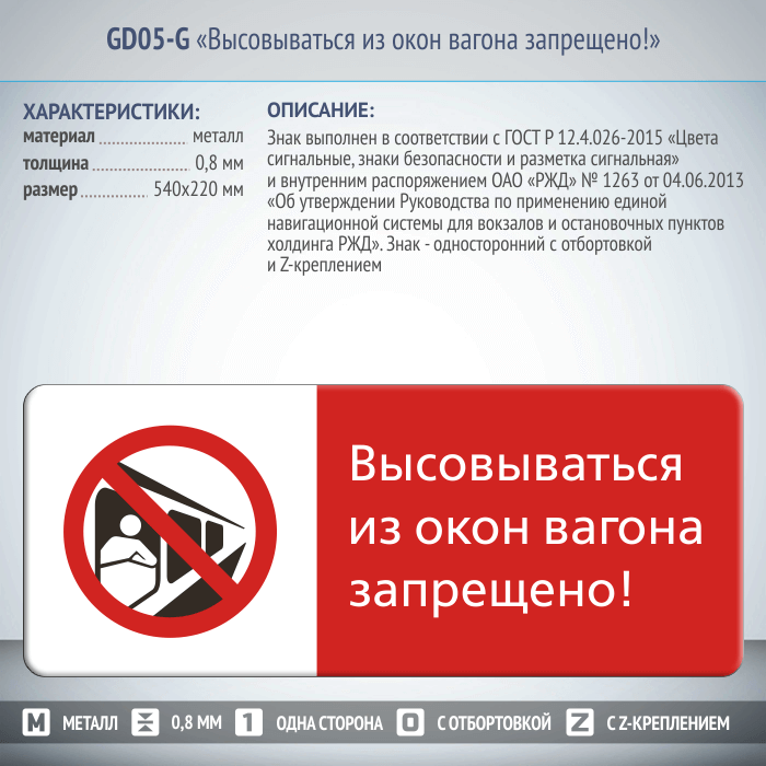 Односторонний знак безопасности «Высовываться из окон вагона запрещено!» изготовлен на металле, толщиной 0,8 мм и размером 450х700мм в соответствии с:
