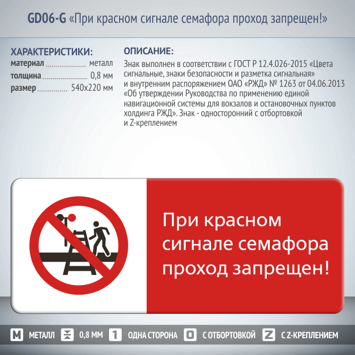 Знак «При красном сигнале семафора проход запрещен!», GD06-G (односторонний горизонтальный, 540х220 мм, металл, с отбортовкой и Z-креплением)