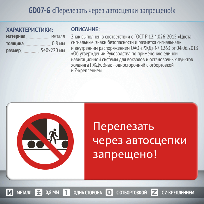 Знак «Перелезать через автосцепки запрещено!», GD07-G (односторонний горизонтальный, 540х220 мм, металл, с отбортовкой и Z-креплением)