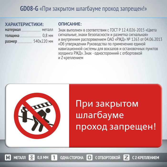Односторонний знак безопасности «При закрытом шлагбауме проход запрещен!» изготовлен на металле, толщиной 0,8 мм и размером 450х700мм в соответствии с: