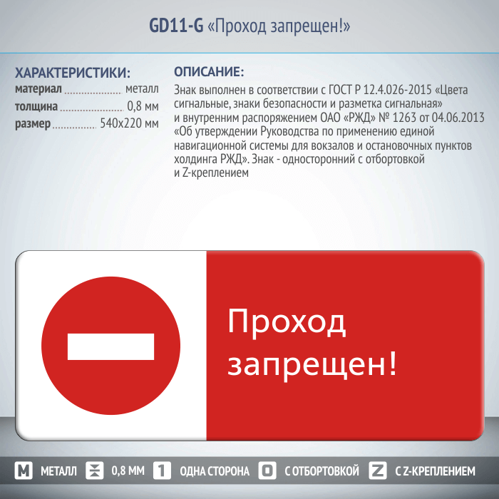 Знак «Проход запрещен!», GD11-G (односторонний горизонтальный, 540х220 мм, металл, с отбортовкой и Z-креплением)