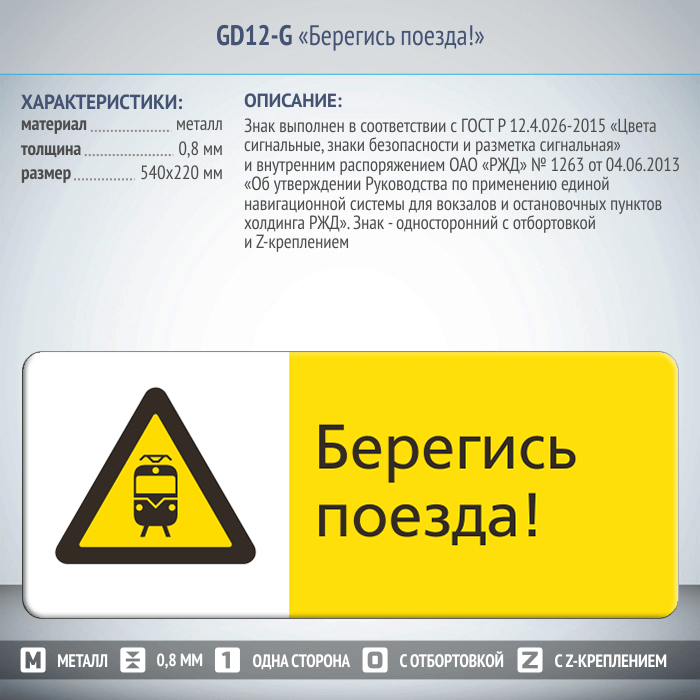Знак «Берегись поезда!», GD12-G (односторонний горизонтальный, 540х220 мм, металл, с отбортовкой и Z-креплением)