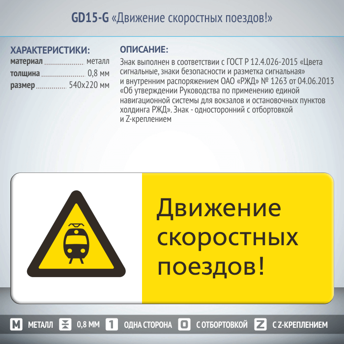 Знак «Движение скоростных поездов!», GD15-G (односторонний горизонтальный, 540х220 мм, металл, с отбортовкой и Z-креплением)