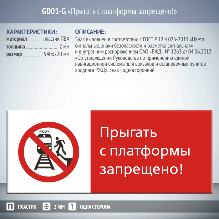 Знак «Прыгать с платформы запрещено!», GD01-G (односторонний горизонтальный, 540х220 мм, пластик 2 мм)